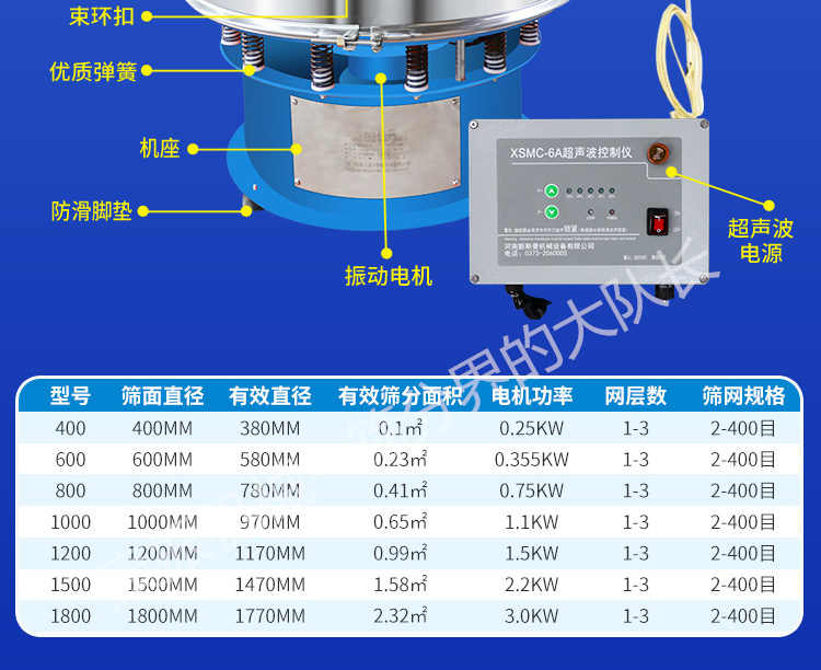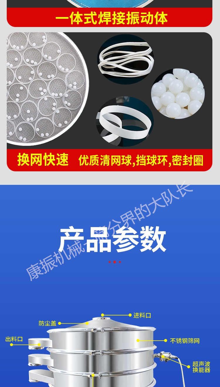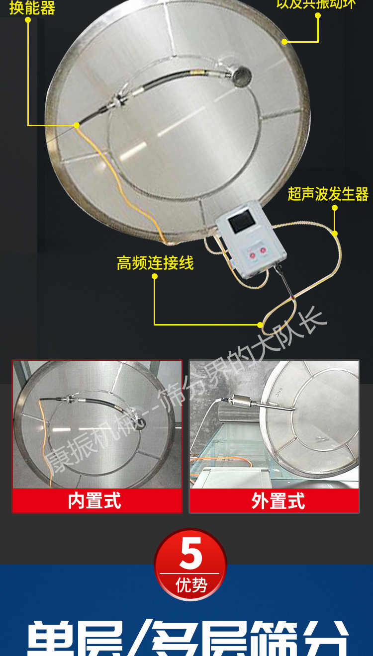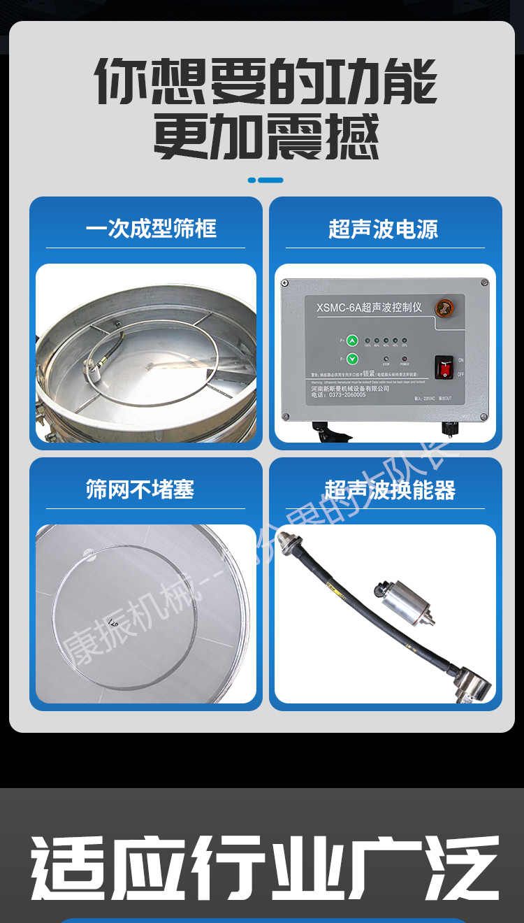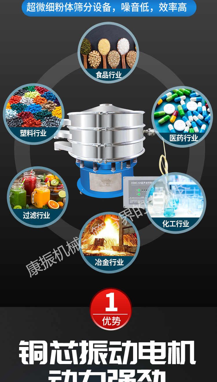 超聲波振動篩是在旋振篩的基礎上引入了超聲波清網裝置,通過將220V、50Hz或110V、60Hz電能轉化為18KHz的高頻電能,輸入超聲換能器,將其變成18KHz機械振動,從而達到高篩分和迅速清網的目的,使超微細粉篩分成為易事。該系統在傳統的振動篩基礎上在篩網上引入一個低振幅、高頻率的超聲振動波(機械波),以改善超微細粉體的篩分性能。特別適合高附加值精細粉體的用戶使用。超聲波篩分系統是一種簡單實用、可靠的篩分系統,是當前網孔堵塞的有效的解決方法??蓮V泛應用于制藥、冶金、化工、選礦、食品等要求精細篩分過濾的行業,篩分過濾精度高,有效解決因團聚、靜電、強吸附性卡堵網孔等篩分難題,是國內篩分行業的一項重大技術突破。