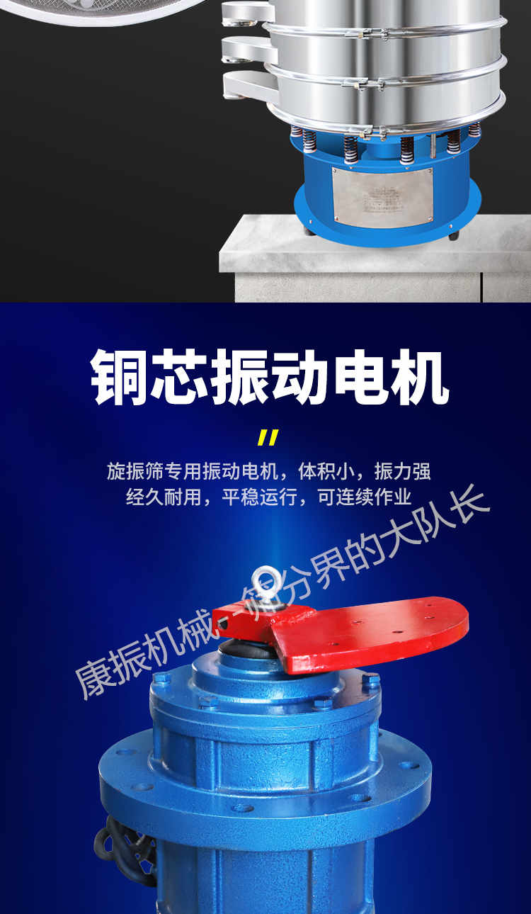 一、旋振篩是一種高精度細粉篩分機械,其噪音低、效率高,快速換網只需3-5分鐘,全封閉結構,適用于粒、粉、粘液等物料的篩分過濾。旋振篩是由直立式振動電機作激振源,電機上、下兩端安裝有偏心重錘,將電機的旋轉運動轉變為水平、垂直、傾斜的三次元運動,再把這個運動傳遞給篩面。調節電機上、下兩端的相位角,可以改變物料在篩面上的運動軌跡。